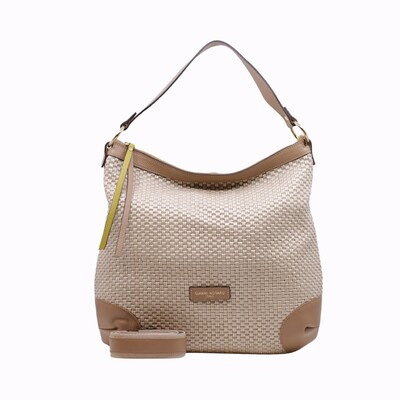 Deze handtas is uitgewerkt in rafia en leder.