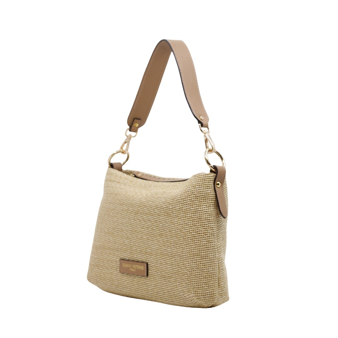 Handtas van het Italiaanse merk Carol J. Deze is uitgevoerd in rafia en leder. Afmetingen zijn : 20 cm hoogte(midden van de handtas), 26 cm breedte en 6 cm diepte.