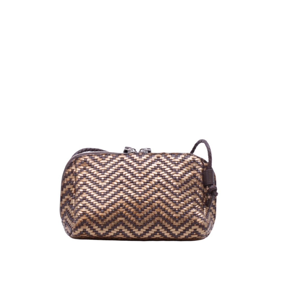 Gevlochten handtas van Allan K. De afmetingen zijn : 13 cm hoog, 19 cm breed en 8cm diep.