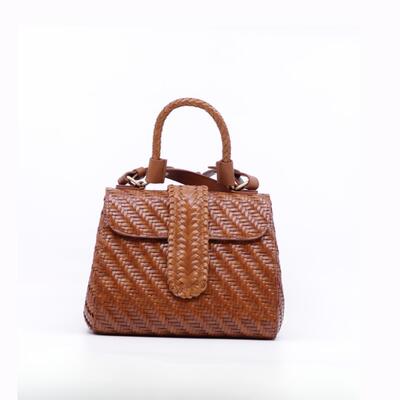 Gevlochten handtas van Allan K. De afmetingen zijn : 16 cm hoog, 20 cm breed en 11 cm diep. Lange riem aanwezig.
