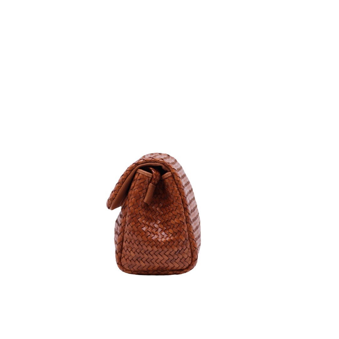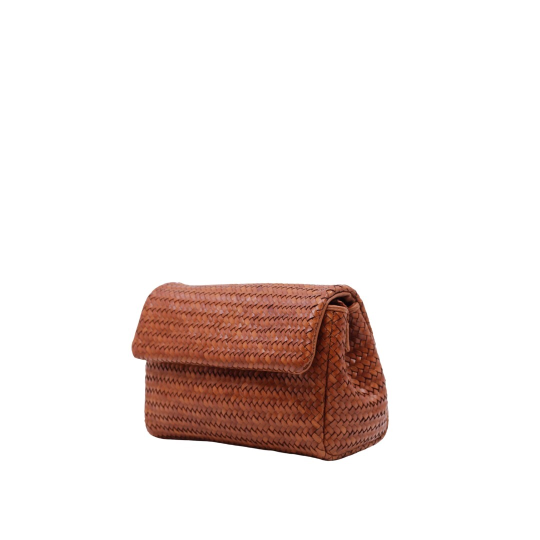 Gevlochten handtas van Allan K. De afmetingen zijn : 14 cm hoog, 23 cm breed en 10.5 cm diep.