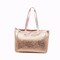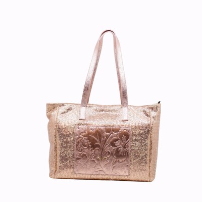 Deze handtas is uitgevoerd in stof/leder, gekleurd in roos metalic.