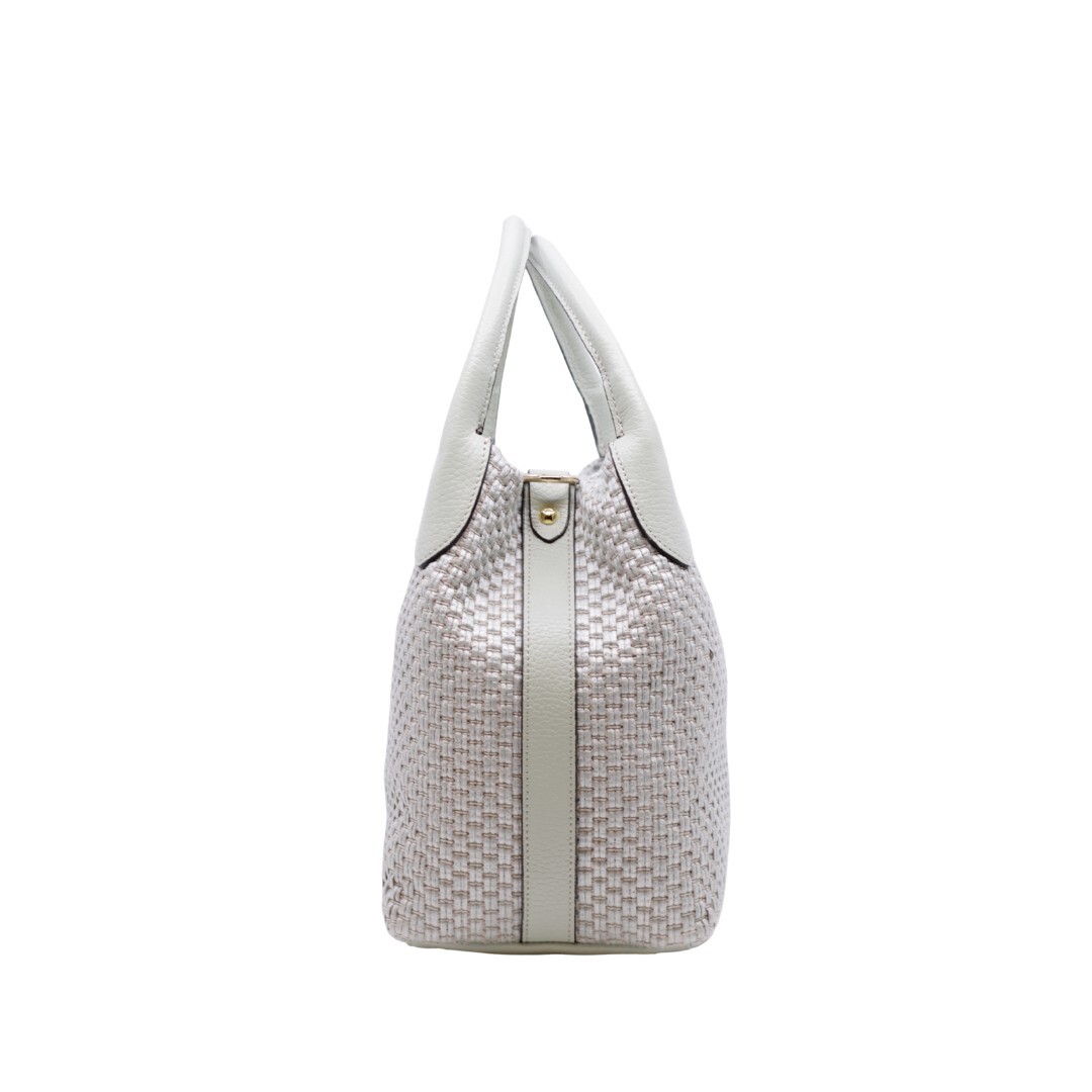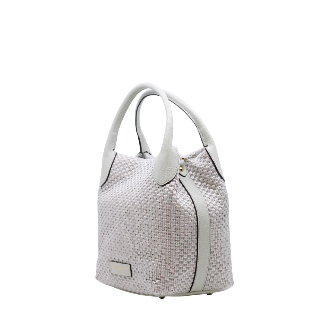 Handtas van het Italiaanse merk Carol J. Deze is uitgevoerd in rafia en leder. Afmetingen zijn : 24 cm hoogte(midden van de handtas), 21.5 cm breedte en 15 cm diepte.