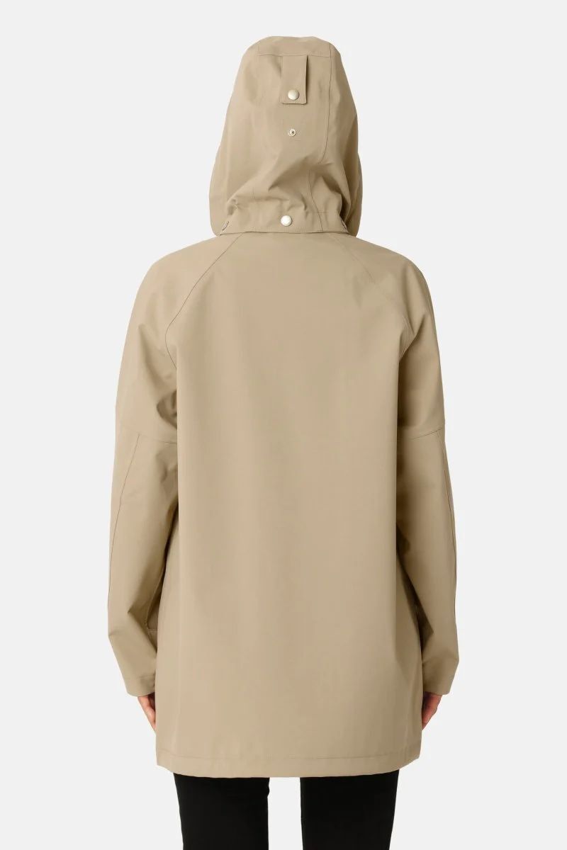 Dit ruimvallende regenjack met raglanmouwen biedt comfort en optimale bewegingsvrijheid. De afneembare, verstelbare capuchon en verstelbare manchetten zorgen voor extra bescherming tegen wind en regen. De YKK 2-weg rits is verborgen onder een beschermende voorflap voor een strakke uitstraling. De jas valt over de heupen en heeft een verstelbare zoom voor extra windbescherming. Gestikte voorzakken geven het ontwerp een minimalistische en moderne look, perfect voor zowel de stad als outdooractiviteiten. Gemaakt van een 3-laagse stof met een TPU-membraan en een lichte tricot achterkant. De jas heeft een waterdichtheid van 10.000 mm en een ademend vermogen van 5.000 g/m², en is afgewerkt met een water- en vuilafstotende coating voor extra duurzaamheid.